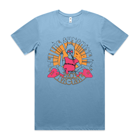 Introducing the new summer collection! "Let The Sunshine In," lyrics from Rose Coloured Glasses, are colorfully displayed on a muted blue tee accompanied by artwork from the RCG video.