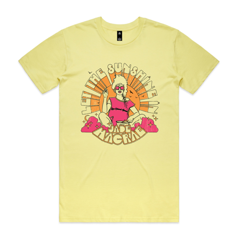 Introducing the new summer collection! "Let The Sunshine In," lyrics from Rose Coloured Glasses, are colorfully displayed on a yellow tee accompanied by artwork from the RCG video.
